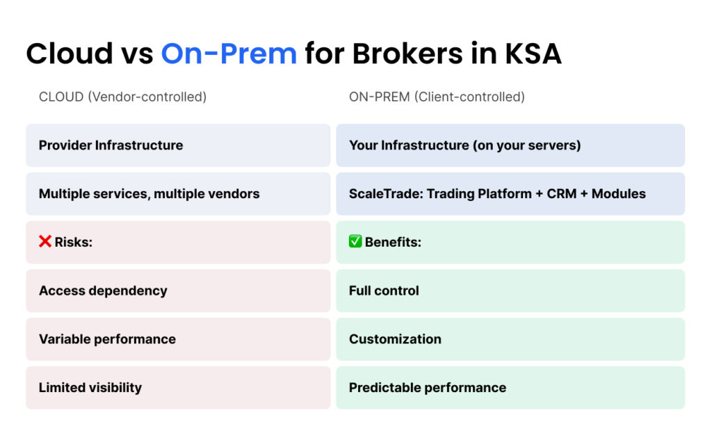Cloud means your data sits on someone else’s hardware, in jurisdictions you might not control. For KSA brokers handling client funds and personal information, this creates problems: